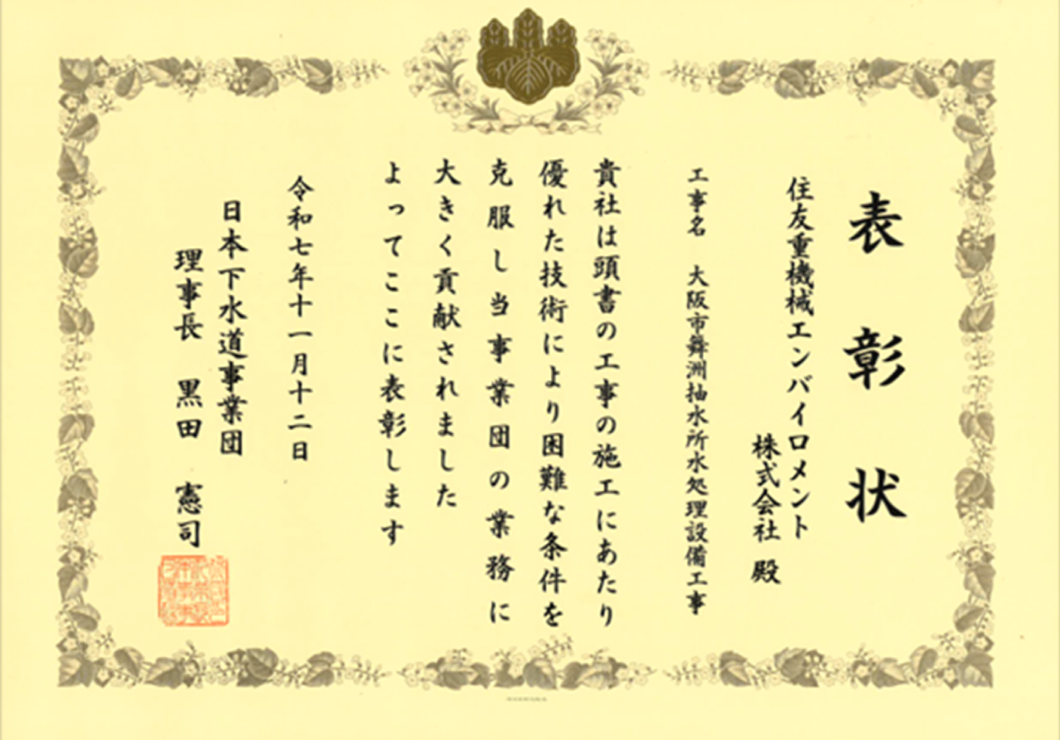 2025年11月12日(水)、弊社は下記工事において日本下水道事業団より2025(令和7)年度優良工事表彰を受賞しました。