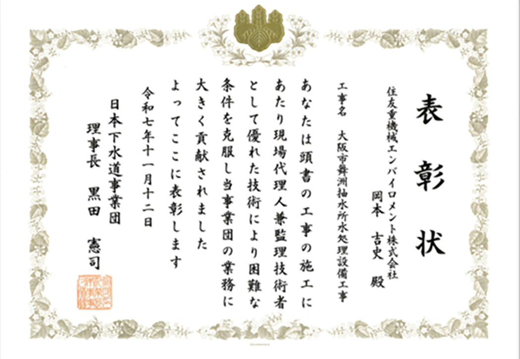 2025年11月12日(水)、弊社の現場代理人兼監理技術者である岡本 吉史は下記工事において日本下水道事業団より2025(令和7)年度優良工事技術者表彰を受賞しました。